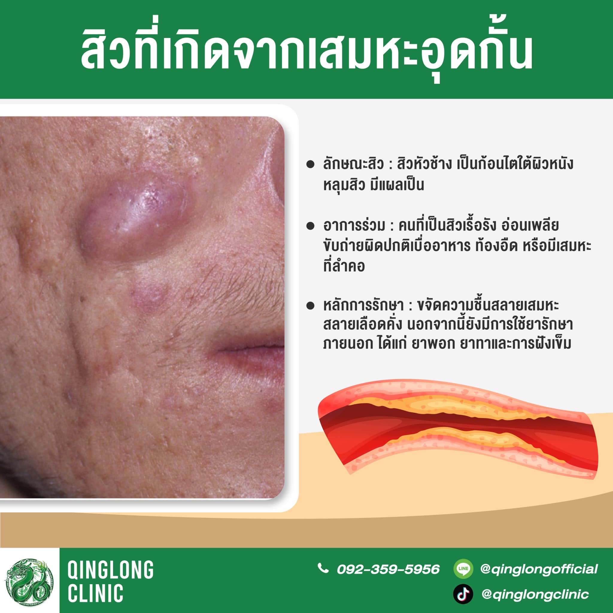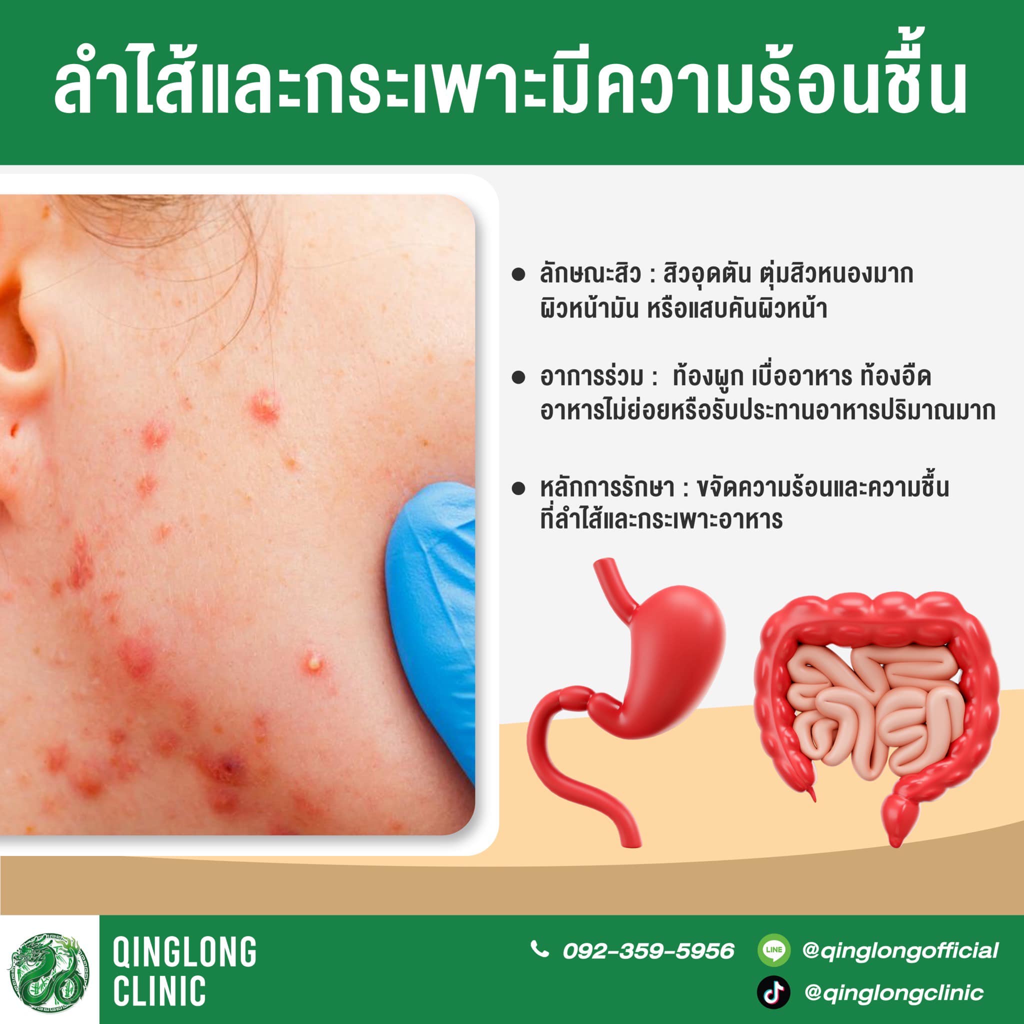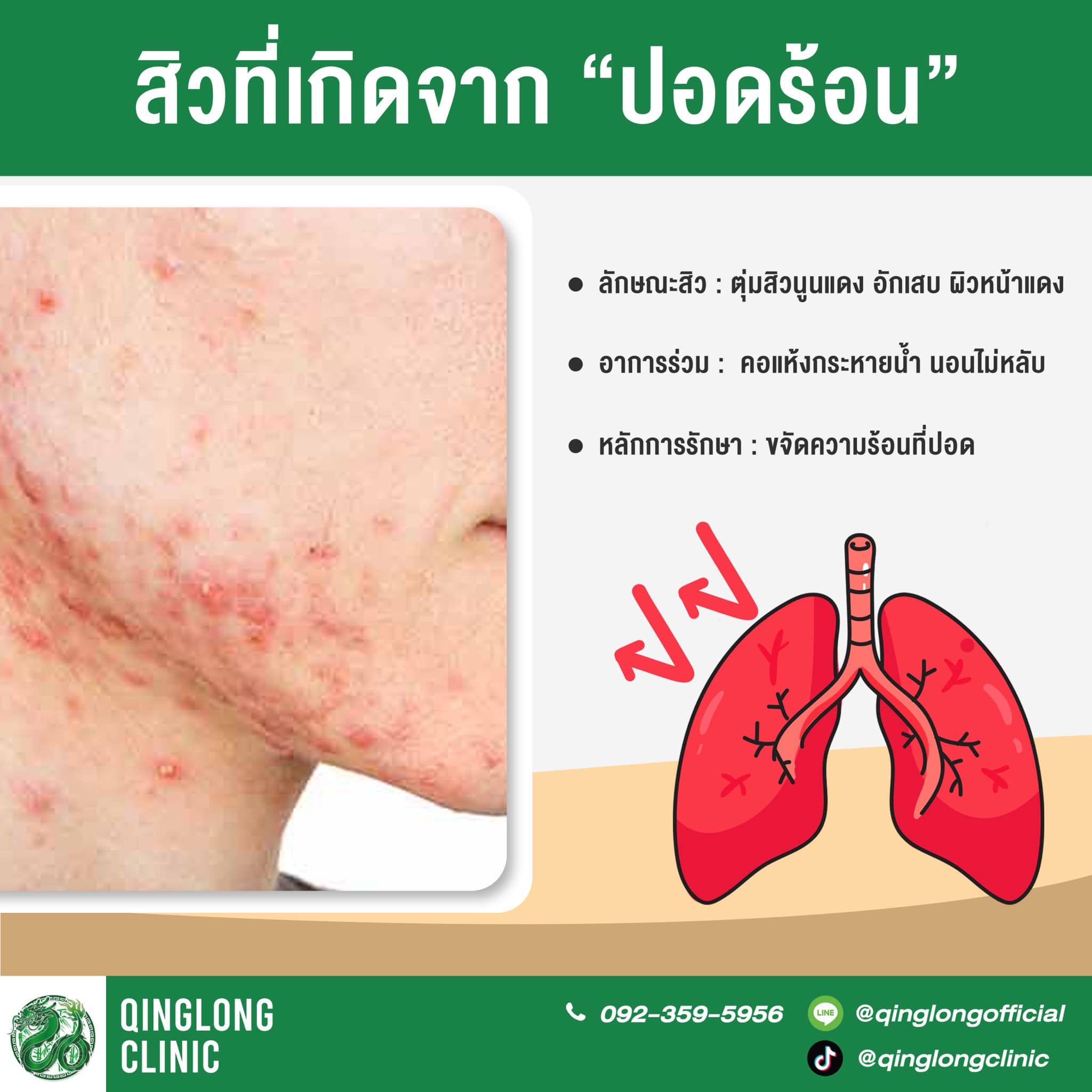 โดยอาการเหล่านี้มักก่อให้เกิดสิวที่เกิดจากภายในสู่ภายนอกทางชิงหลงคลินิกมีวิธีการรักษาด้วยศาสตร์แพทย์แผนจีน โดยการฝังเข็ม ครอบแก้วควบคู่กับการทานยาจีนและทานชาสมุนไพรจีนที่ช่วยทั้งเรื่องบำรุงผิวพรรณ ขจัดความร้อนที่สะสมช่วงปอด กระตุ้นลำใส้เพื่อให้ระบบย่อยอาหารและกระเพาะอาหาร ขจัดของเสียต่างๆที่สะสมในร่างกายทำงานได้ดียิ่งขึ้นสุดท้ายอยากฝากให้คนไข้ทุกท่านดูแลสุขภาพ เลี่ยงอาหารรสจัด ของทอดของมัน ดื่มน้ำ พักผ่อนให้เพียงพอ ขับถ่ายเป็นประจำ เลี่ยงการสัมผัสใบหน้า และหลีกเลี่ยงความเครียดเพื่อลดปัญหาสิวที่เกิดจากภายในและภายนอก ด้วยความห่วงใยจากหมอไท้แพทย์แผนจีนชิงหลงคลินิก